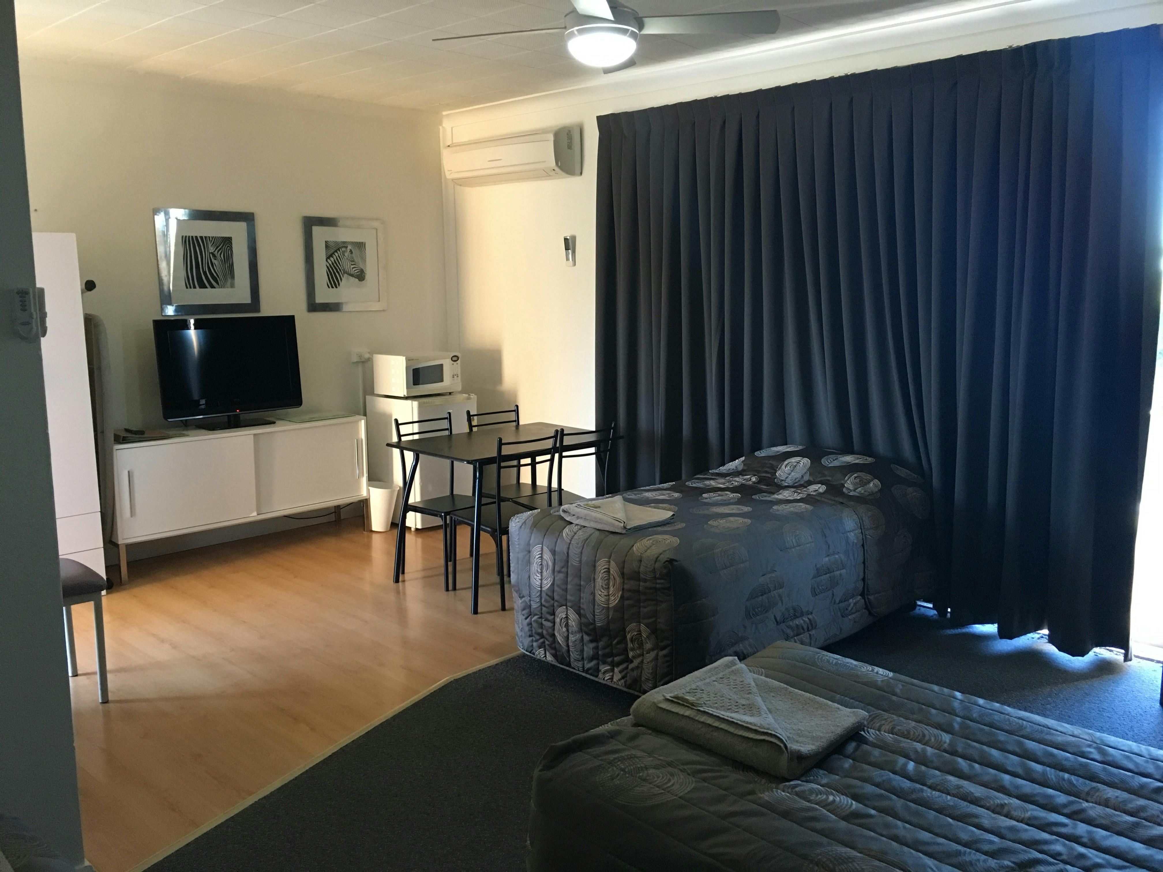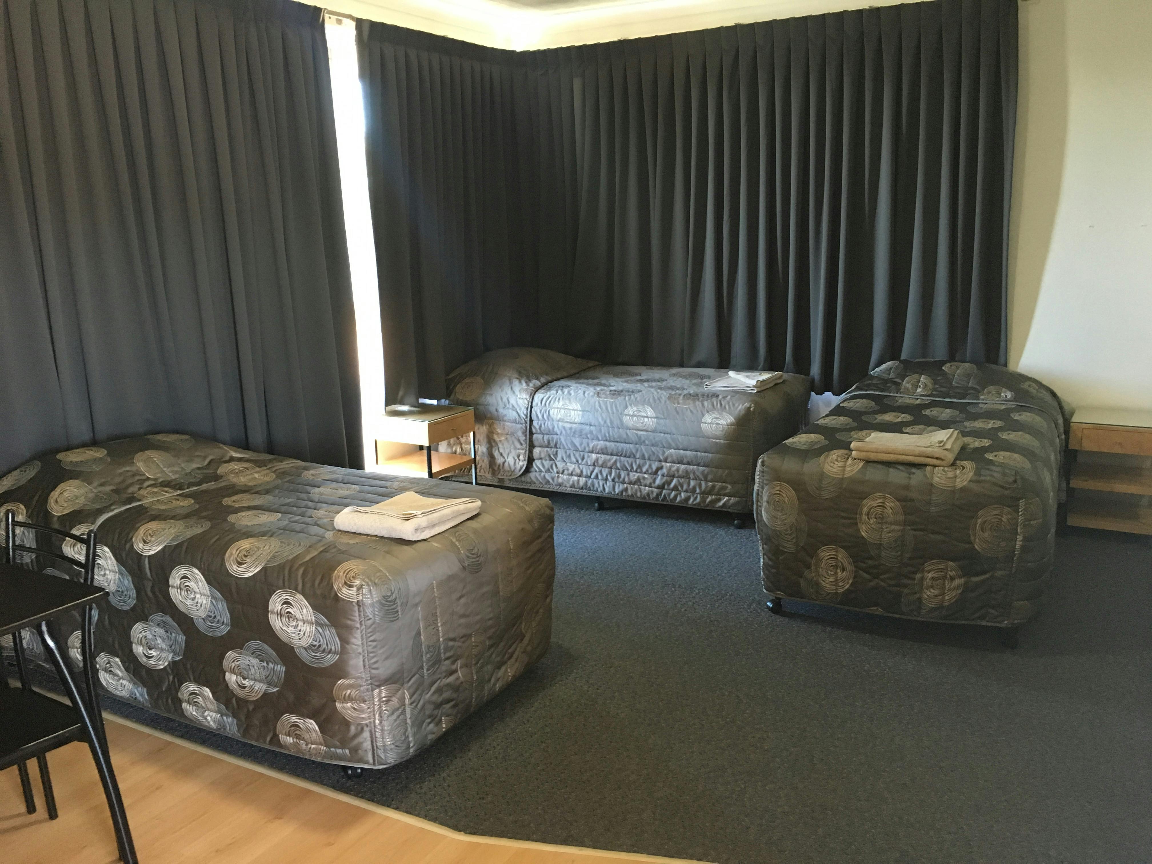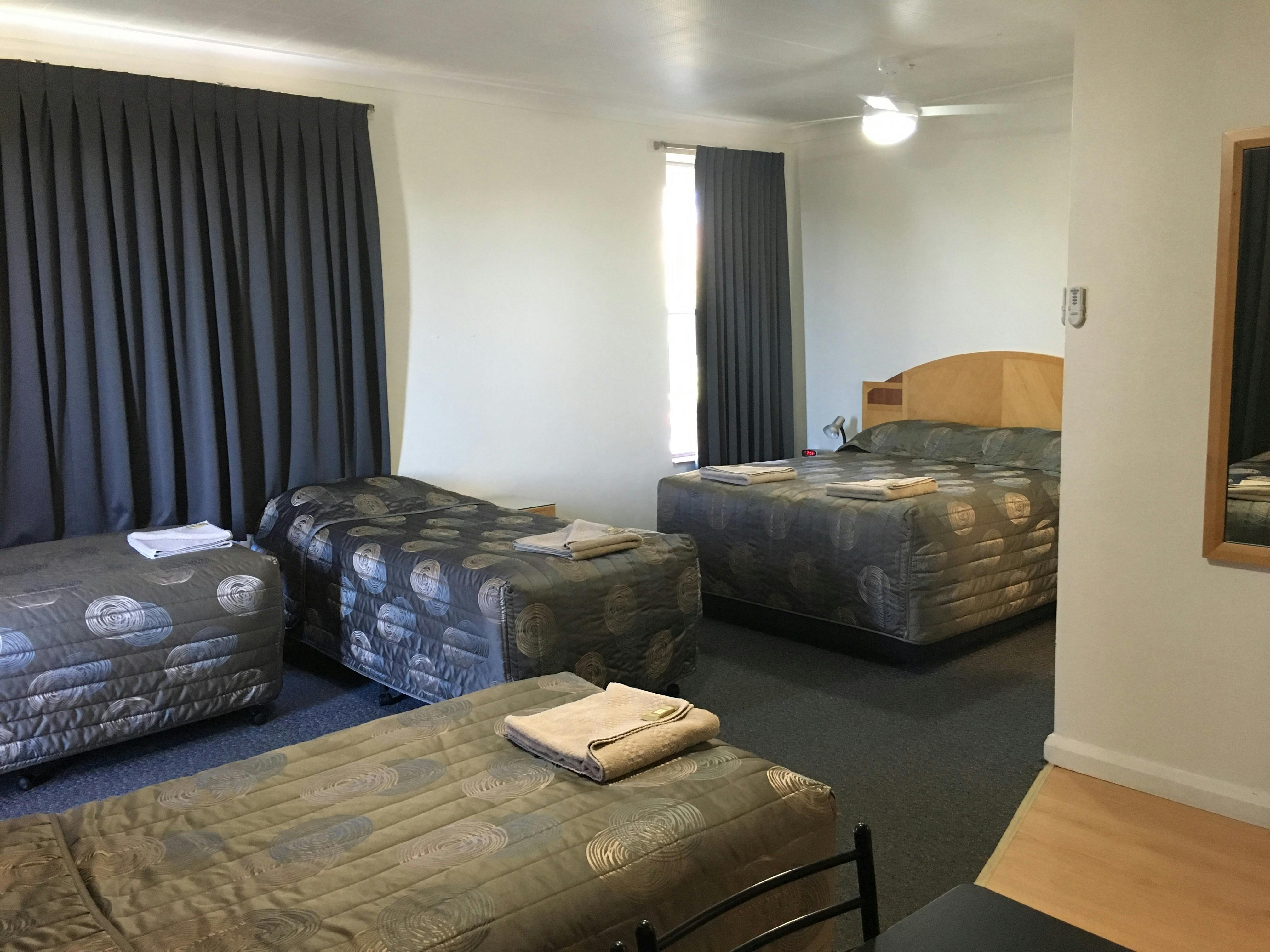 This is an ensuite room with premium quality Sealy Posturepedic pillowtop beds - 1 x Queen bed and 3 x Single beds, free Wi-Fi internet, Foxtel sports & movies, 81cm LCD TV, quiet Mitsubishi split system air-conditioning, ceiling fans, hair dryer, tea & coffee, bar fridge, microwave and toaster. Due to availability - this room may be located upstairs on the first level.